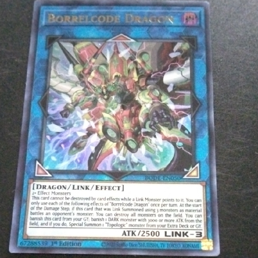 Borrelcode Dragon Yu-Gi-Oh! trading card. Vivid blue holo frame with multicolored dragon artwork. Collectible game card for decks and displays.