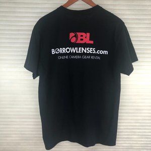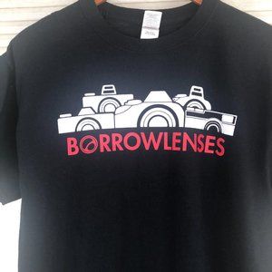 Borrow Lenses Camera Graphic Black & White Short Sleeve Cotton T-Shirt. Excellent pre-owned condition, no flaws or stains.