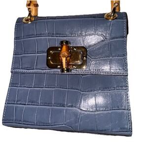 The Borse in Pelle Mini Croc Embossed Italian Leather Handbag Purse with a Bamboo Handle is a stylish and luxurious accessory for women. Made with high-quality leather and featuring a square shape with a toggle closure, this mini handbag is perfect for special occasions like weddings, parties, or business events. The blue-gray exterior with crocodile pattern, combined with the gold hardware, bottom studs, and brown bamboo handle, adds a touch of elegance and sophistication to any outfit. With an inner pocket for organization and a fabric lining in black, this designer handbag exudes a classic and chic style.