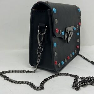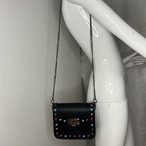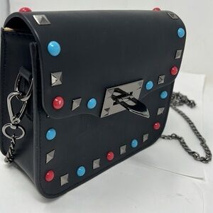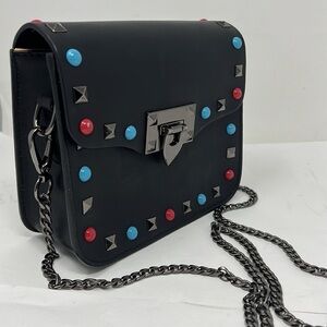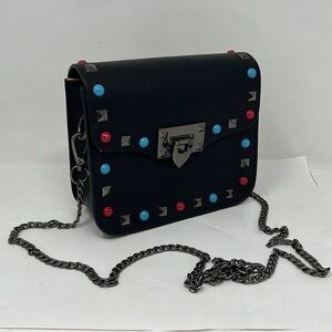This is a beautiful Borse in Pelle Studded Black Matte Leather Shoulder Crossbody Bag Made In Italy. Excellent condition other than a couple of scuffs on two of the red studs. Can easily be touched up with red polish. No odors. No stains. No tears. 7” x 6” x 2.5” with detachable 21” chain strap