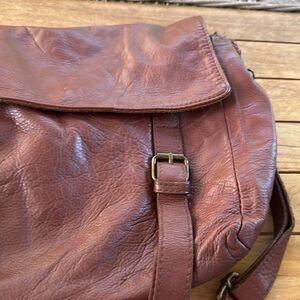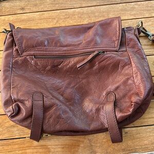 12”Wx13”Lx5” brownish-red (maroon) crossbody bag. Has multiple compartments inside & outside. Made in Italy. Has some staining on inside fold over flap as seen in pic.