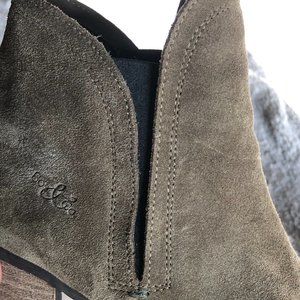 Bos. & Co. Belfield Waterproof Chelsea Boot. Distressed suede and waterproofed finish, stacked heel with covered elastic-gore insets to ensure a custom fit. Moss green suede is distressed and in very good condition, only slight signs of wear. Chic and comfortable.