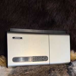 Compact Bose boombox with sleek silver and black design. Delivers powerful sound.