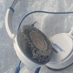 Stylish Bose headphones. Crisp white with blue accents. Comfortable over-ear design.In excellent used condition,ear muffs show wear