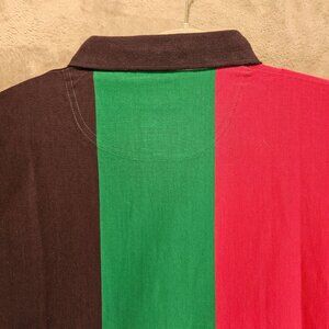 This Boss America men's polo in size L features a colorful color block design. Its 1/4 button, hi-lo hem, and 100% cotton make it perfect for bowling, street wear, or a hipster grunge look.