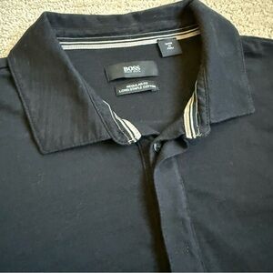 This Boss polo shirt in sleek black offers a timeless style with its classic collar and short sleeves. Crafted from a comfortable cotton blend, it provides a polished look suitable for any occasion.
