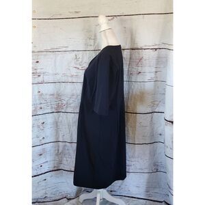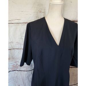 Navy blue v neckline short sleeve wool blend crepe dress with back zip closure. Knee length. Great professional dress. In great condition.