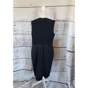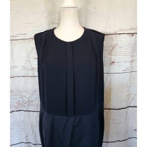 Navy blue sleeveless back zip closure dress with pleated crepe top and pinstripe wool blend skirt. In excellent condition.