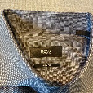 Boss Hugo Boss gray and white patterned dress shirt. Handsome fabric. Size 15. No issues with this item other than it does not fit me any longer.