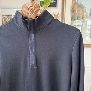 BOSS Hugo Boss midnight blue quarter zip 100% cotton pullover sweater with dark blue contrast fabric at the placket and shoulder. Brand tab at the hip. Laying flat measures 27 inches shoulder to hem and 20 inches armpit to armpit.Please note that in our opinion this sweater is more fitted. That is our experience with this brand. The knit is tight and smooth for a refined look. Please note that the inside care tag has been clipped. This is machine washable on gentle, line dry. I have two other sweaters, just like this, one in gray and one in dark blue. I am happy to bundle. Let me know if you have any questions.