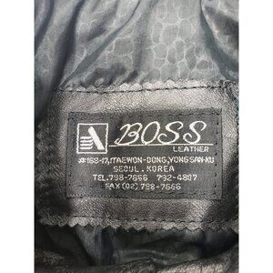 Condition is preowned. Boss Leather Black Leather Bomber Motorcycle Full Zip Button Up Jacket Size ?. There is no size listed anywhere will post measurements in pictures. Measurements are 24in x 24in Jacket is in good condition. USPS Shipped. Please see all pictures.
