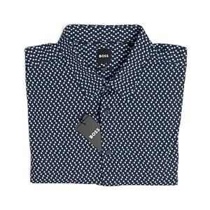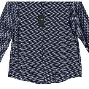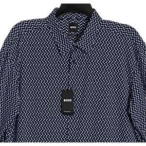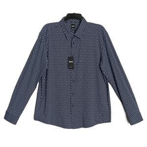 This listing is for a new with tags Boss Men's XL Button-Up Shirt in a Blue & White Diamond Print. Slim Fit, Long Sleeve, Stretch Fabric. 87% Polyamide, 13% Elastane, Machine Washable. MSRP $198.