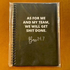 Black notebook with white lettering “As for me and my team, we will get shit done. Boss 24:7.” Perfect gift for a dedicated boss or office manager with a sense of humor! 118 college ruled lined pages. Metal spiral bound. 6” wide, 8” tall. Comes in plastic sleeve as pictured. Gifted from The Good Vibe Crew shop on Etsy. Retails for $14. Brand new, never used. From smoke free, pet free home.