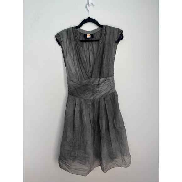 Boss Orange Gray Dress Women 6 Pleated Sheer Cap Sleeve Embellished Waist
