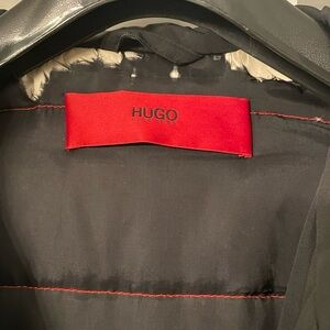 Stay warm and stylish with this sleek black hooded jacket. Perfect for any occasion. Has some tearing on the inside.