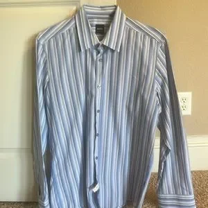 Blue and white striped button down shirt. Very good condition. Size large regular fit
