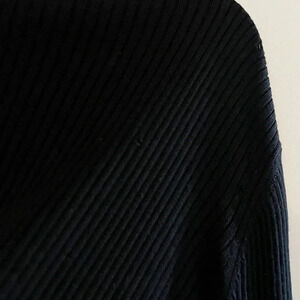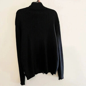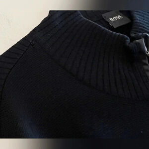 Boss by Hugo Boss black ribbed full zip cardigan sweater. Size L-xl with a faux sateen trimming. There are moth holes throughout the sweater. On the back, sleeves and front. Shown in the last 8 photos.
