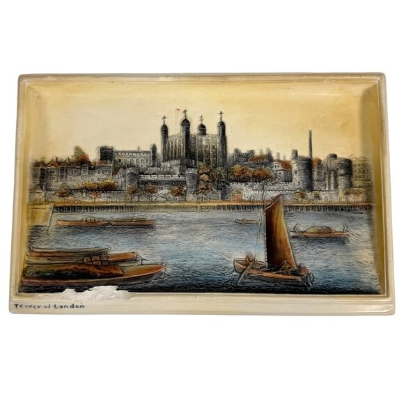 This vintage handcrafted 3D wall plaque showcases a detailed relief depiction of Tower of London and the Thames River. Ideal for collectors or decor.