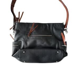 Bostanten Black Leather Shoulder Tote Bag Purse Zip Pockets Adjustable Strap RETAIL $120