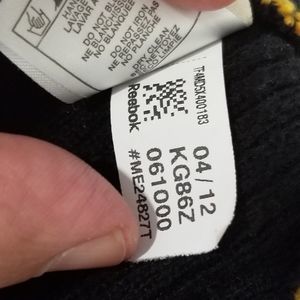 The Boston Bruins hat is a winter hat made by Reebok in 2012. It features the iconic Boston Bruins logo, which consists of a black "B" inside a black circle with white spokes. The hat is predominantly yellow with black and white accents, and it has a pom-pom made of black, white, and yellow yarn on top. The bottom part of the hat is black with the word "Bruins" embroidered in white script.