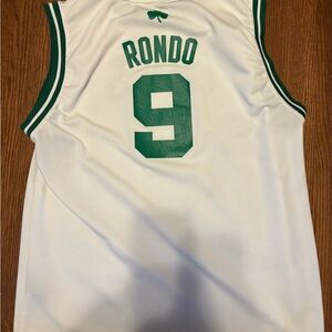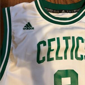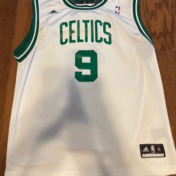 White basketball jersey featuring green Celtics lettering and number 9. Adidas logo included.