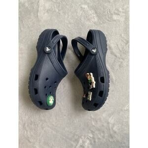 The product is a pair of Boston Celtics blue crocs in size 7M (men) or 9W (women). These slip-on sandals are made of rubber and are suitable for casual or travel occasions. The outsole, upper material, and insole of the crocs are all made of rubber, ensuring comfort and durability. This specific model features the Boston Celtics team colors and logo, making it a stylish and functional addition to any fan's footwear collection.