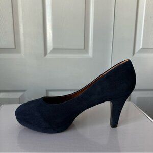 These blue suede heels feature a rounded toe and a medium-height heel, offering a classic and comfortable fit. The platform sole adds extra comfort, making them perfect for professional settings or formal occasions. With a soft, velvety texture, these shoes provide a timeless and versatile look.