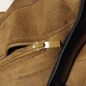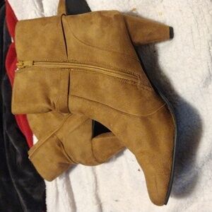 Fabulous cruelty free faux suede brown booties from Boston Design Studio. Great for city fashion. Zipper close. 3" heel. One small line on inner right shoe, pictured.