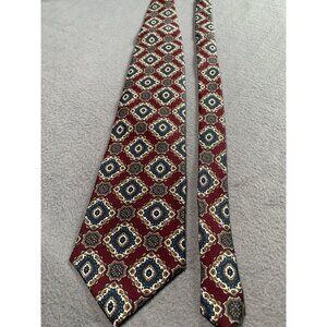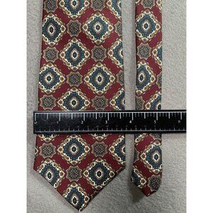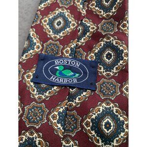 This Boston Harbor silk necktie features a sophisticated geo pattern in burgendy, green, and gold hues. Size is 3.5 inch wide and 58 inch long, perfect for any formal occasion or office wear.