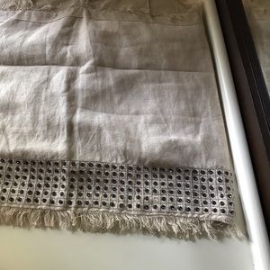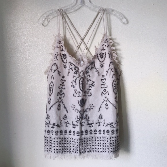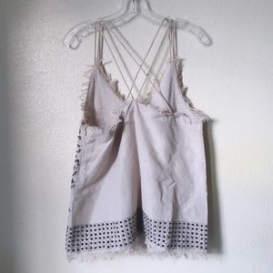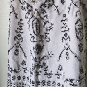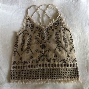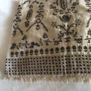 Glittery linen blend strappy top with sequins and bead detailing all over. In excellent shape! Only flaw captured in last photo. Frayed at top and bottom hems. Cotton lining. Side zip.