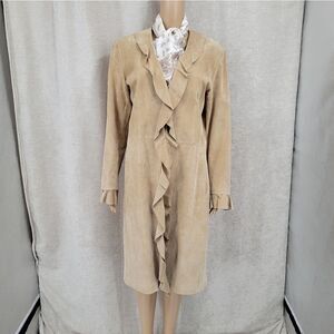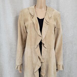 Tan soft suede with waterfall like lapel / slightly ruffled and scalloped lapel and cuffs.