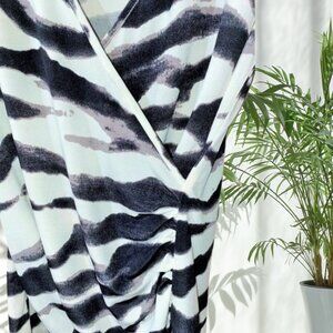 Elevate your wardrobe with this fierce and flattering Boston Proper cold shoulder blouse in a striking black, white, and grey animal print. Designed with a plunging V-neckline and wrap-style cinched waist, this top enhances your silhouette with a bold, confident edge. The cold shoulder cut adds a trendy, feminine touch while keeping it effortlessly chic. Size XS. Perfect for nights out, date nights, or elevated casual wear. Stylish and versatile—pair with jeans, faux leather pants, or a sleek skirt for instant glam.