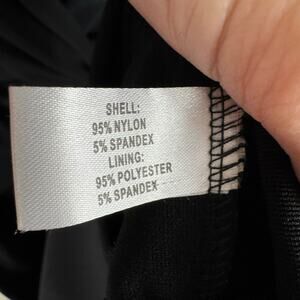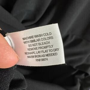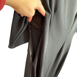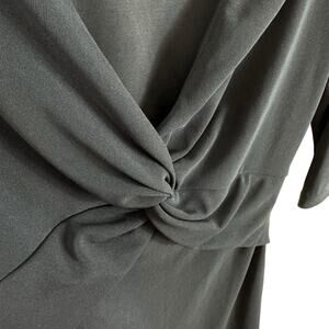 Excellent preowned condition. Black jersey knit 3/4 sleeve twisted V-Neck sheath dress. Zips up left side. Nylon/polyester/spandex material. Approx. measurements: Shoulder to hem 36", pit to pit 20", sleeve from neck to sleeve hem 18". Size 10.