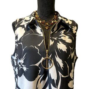 Boston Proper Black & White Floral Sleeveless Zip-Front Dress With Collar