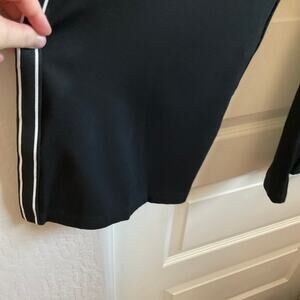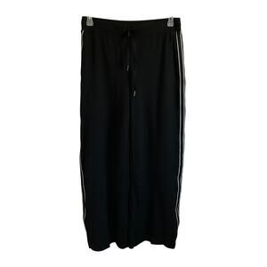 Boston Proper black wide leg pants. These have stripes down the sides. Drawstring waist. No pockets. Athletic material.