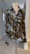 Chic button-down shirt with floral patterns. Black base with gold and white accents. Ideal for stylish outings.