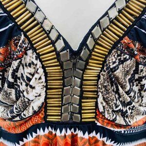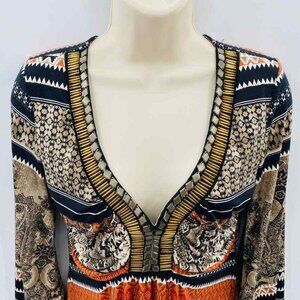 In a vibrant dance of colors and textures, this Boston Proper tunic whispers tales of bohemian adventures. Boasting a striking beaded V-neck, it invites the wearer to embrace their inner wanderer. With its flowing silhouette and captivating patterns, this tunic becomes a canvas for self-expression and free-spirited journeys.