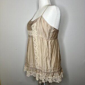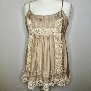 Elegant camisole with lace details. Features a brown striped pattern. Cream lace trim adds a delicate touch. Perfect for layering or wearing alone.