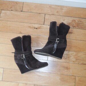 Boston Proper Chocolate Brown Suede Cozy Fur Lined Wedge Ankle Boots 9 1/2