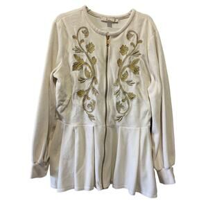 Boston Proper Cream Zip up Embroidery Velour Sweater Size M