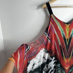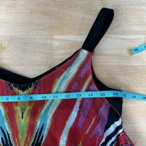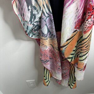 Features vibrant multicolor animal-inspired abstract print in reds, oranges, greens, purple, black, and white.