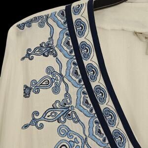 Boston Proper embroidered peasant top in women's size small. Super soft white rayon fabric with embroidery in shades of blue. Long poet sleeves. Lace up v-neck. Elastic at the waist. Gently pre-owned.