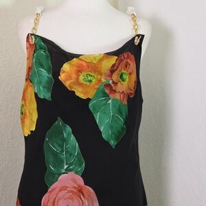 Turn heads in this vibrant Boston Proper floral chain strap dress, size Small. New with tags, this striking piece features a bold multicolor floral print on a sleek black background with a sleek gold chain strap detail and a flattering asymmetrical hem.