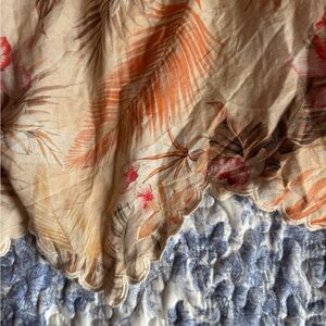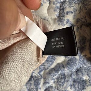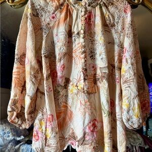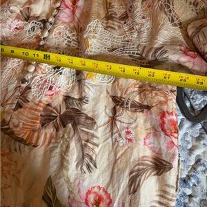 Chic floral linen blouse with intricate lace details scalloped hem, covered buttons Soft pink and cream tones. Perfect for casual elegance. New without belt. Runs big
