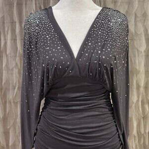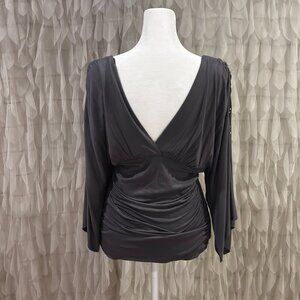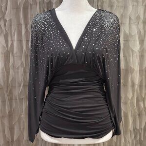 Elegant Boston Proper gray long sleeve top adorned with sparkling silver embellishments across the shoulders and sleeves. Features a plunging V-neckline, flattering ruched bodice, and stretch fabric for a figure-enhancing fit. Perfect for a night out, special events, Christmas parties, or anytime you want to add a touch of glam.