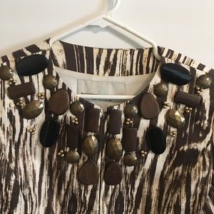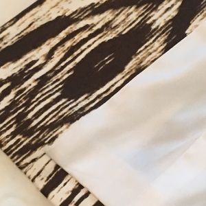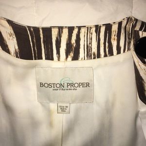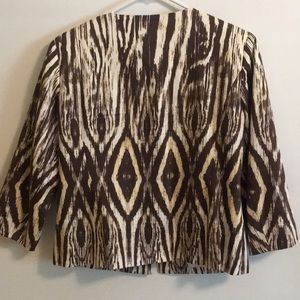 Beautiful Boston Proper Jacket! Brown and cream colors with wooden bead accents around front neckline. Leave front open or close completely for a streamlined look with sturdy hook closures. Fabric has stretch so it’s comfy to wear. Three-Quarter length sleeves. No pockets. Fully lined and finished on inside. This jacket is in excellent condition. Reasonable offers considered.