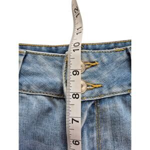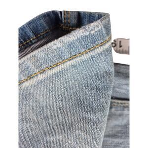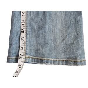 Boston Proper jeans, womens size 6, light wash, distressed denim, boot cut with crystal buttons, crystal rivet at side pockets. Approx measurements: waist laid flat 15 in, front rise 10 in, inseam 32.5 in. Good condition, some wear at hem, small white spot on back, see last photo.