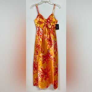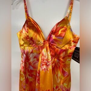 Details: charmeuse satin, luxe La Dolce scarf print design, floral, sweetheart V-neckline, fixed self-tie sash-embellished bodice, sewn-in soft padded cups, adjustable spaghetti straps, double side slits, concealed hook-and-eye zipper closure back, unlined.