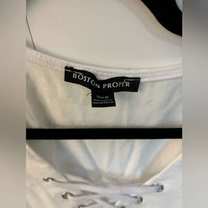 Boston Proper Lace Up Solid White Criss Cross V Neck Blouse Black Puff Sleeve M