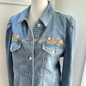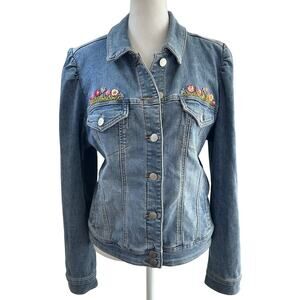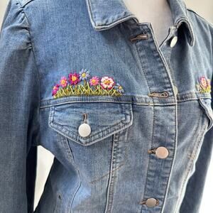 Boston Proper Medium Denim Blue Jean Jacket Floral Embroidered Cotton Stretch